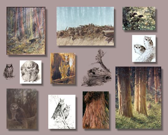 Forest sketches were done during the Carmanah and Tsitika camping expeditions sponsored by the Western Canada Wilderness Committee as part of the BC Artists' on- going efforts to help preserve the old- growth forests. Owl sketches were done at the Owl Rehabilitation Foundation in Vineland Ontario, through the kindness of Kay and (the late) Larry McKeever.