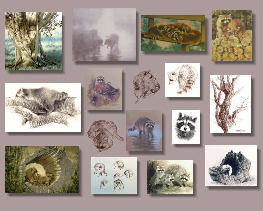 Living and working close to rural areas for most of my life, I have always welcomed raccoons as greatly favoured night visitors. Encouraged by nuts and kibble treats, they become easily accessible for close study while still retaining their independence. Raccoons have been persistent themes in my work for many years.