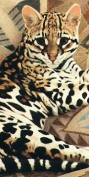 oc·e·lot [ óss-uh-lòt, oss-lòt ] (plural oc·e·lots, oc·e·lot) noun: a medium-sized cat with black markings and rosettes on a light brownish or silver coat that is found in small numbers from the southern United States to South America. Latin name Felis pardalis. But that is only the beginning. Fur like the finest Italian velvet - heaven to the touch, a pattern designed by the gods - no two the same, uniquely intelligent, with remarkable memory, sometimes aloof and introspective - always the stunning grace of a cat. Sometimes almost canine, - earnest, expressive, happily fetching toys or swimming. In true rough-house mode behaving like a monkey, with astounding speed at climbing and leaping antics, powerfully strong, incorrigably creative about reaching a fixed goal. A bewitching sweetness, altogether a glory to watch, and for me, an ongoing inspiration.